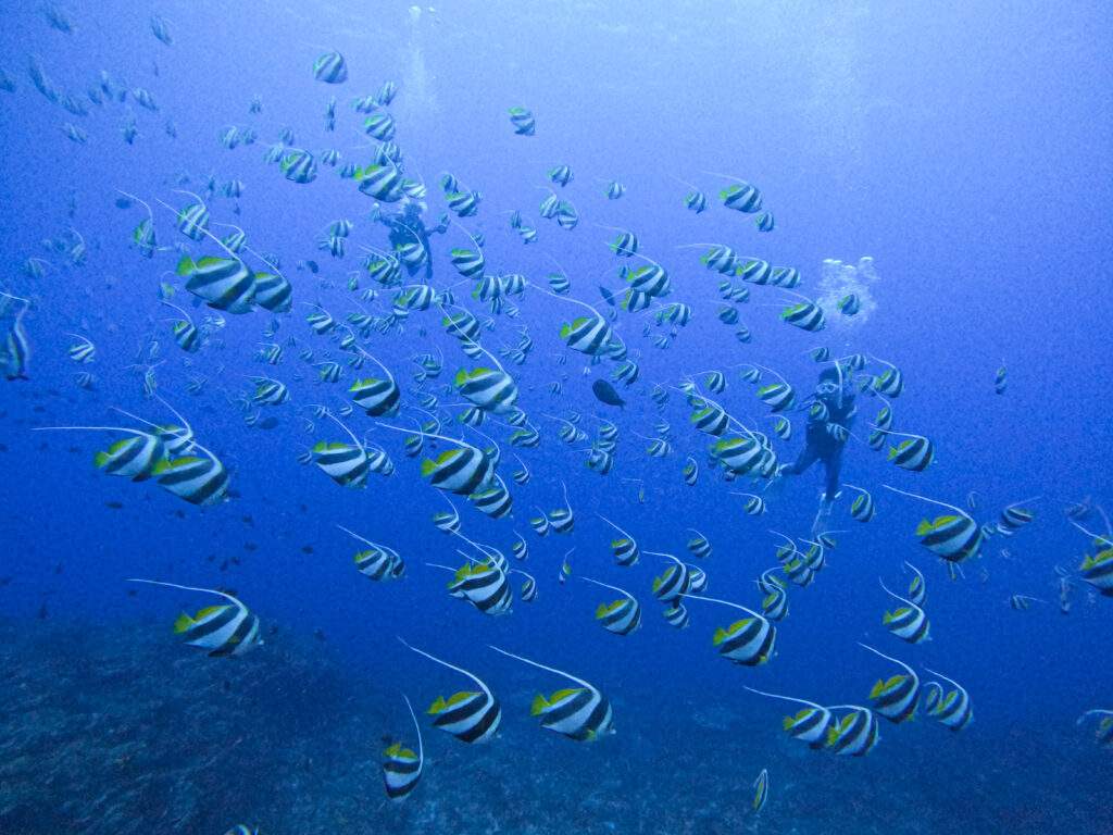 兄島ではオガサワラゼミの声が響き、秋を感じる四季となりました。風は落ち着き海況にも恵まれ、西〜東まで幅広くダイビングポイントに潜ることができました。水中はまだまだ暖かく、27〜28度前後と快適です。小潮周期で流れが少なく緩やかな中で、撮影を楽しむことができました。フォト派ダイバーの撮れ高も良かったと思います。秋はスズメダイの幼魚やチョウチョウウオの幼魚が増え、賑やかな水中が続きます。