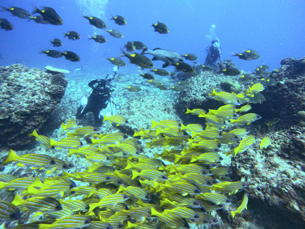 ギンガメアジ、マダラトビエイ、ノコギリダイ、アカヒメジ、キホシスズメダイ、ウメイロモドキ、ユウゼン、タテジマキンチャクダイ、フエヤッコダイ、コビトスズメダイ