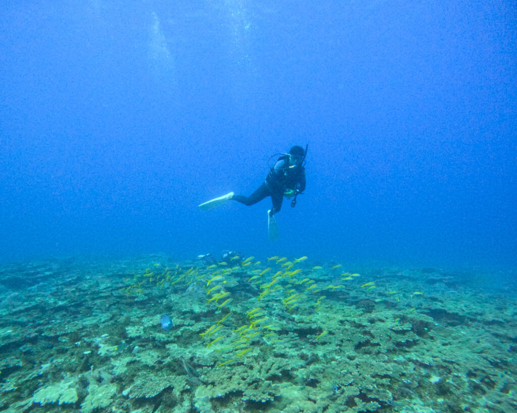 すっかり秋の高水温モードの小笠原、水温は28度前後と、どこを潜っても快適な時期となります。沈船のポイントから定番のコーラルポイントまで幅広く楽しむことが出来ました。マクロリクエストもあり、スズメダイの幼魚や、色の鮮やかなハナダイの観察・撮影も出来ました。そんな中、湾内のメジャーな沈船では、まさかのマンタが登場・・・悠々と沖へ向かって泳ぎ去っていきました。「何が起こるか分からない海、小笠原」をゲストと味わう事が出来ました。