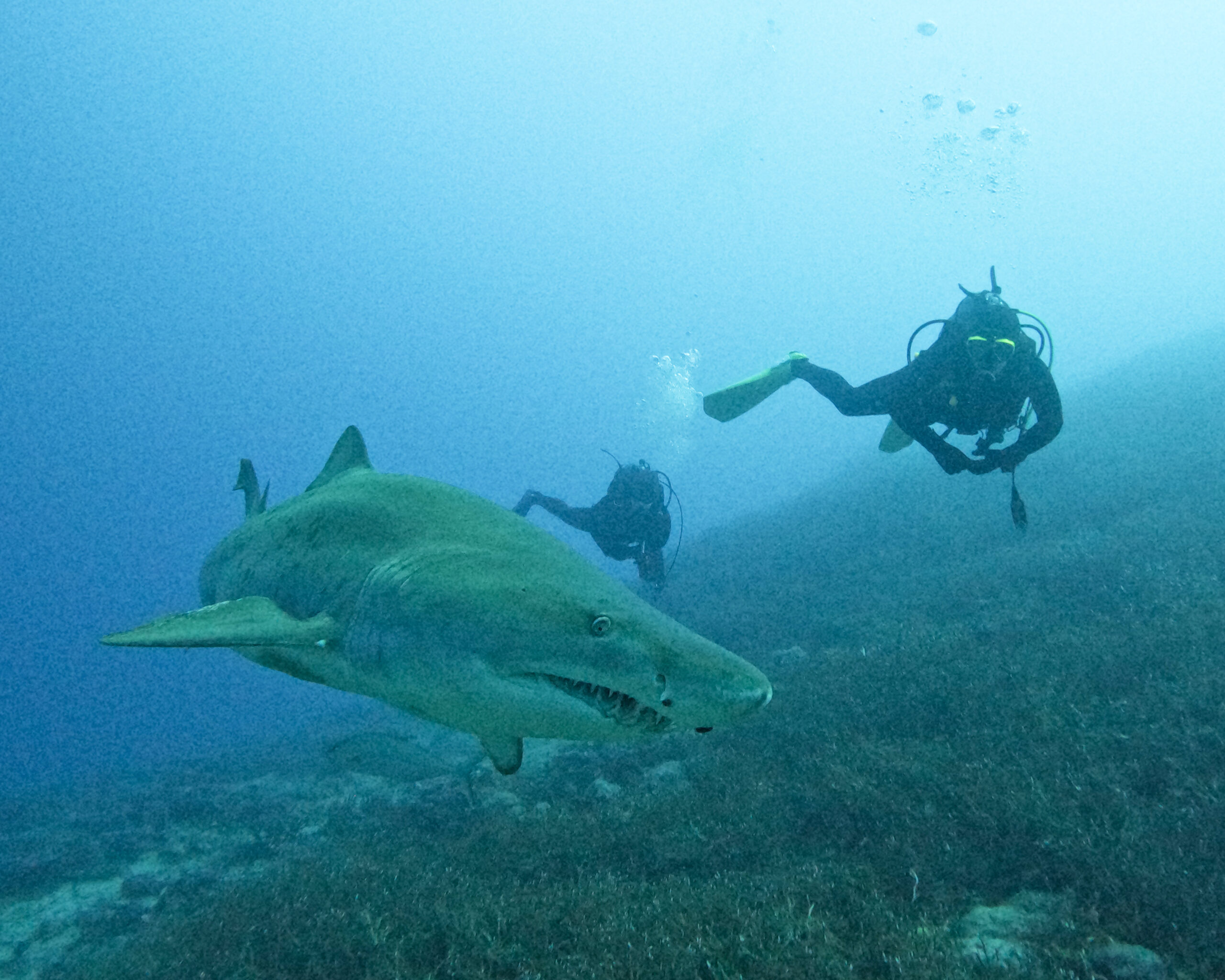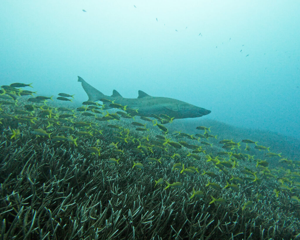 3月に入り、小笠原は冬シーズンの真っ盛りです。水中ではクジラの鳴き声が響き渡り、ダイバーはタカサゴの群れに巻かれます。そんな中、この時期の定番で入る湾内のエダサンゴでは、シロワニの数も安定して見られました。シロワニの数が増えてくると深場の沈船だけではなく、サンゴ沿いの10m〜15mの深度の浅場にもいることがあります。今回はまさにそのシーンに出くわすことができ、じっくりと時間をかけて観察することが出来ました。ちなみにですが、オスの個体よりメスの個体の方が一定の場所でドンと佇んでいて、ダイバーからすぐに離れようとしないことがよくあります。(水中でのアプローチ方法などはブリーフィングでお話させていただきます。)最近の水温は20度前後です。今年の水温の低下はここまででしょうか?これから少しずつ上昇してくれれば、水中がより快適になりますね。これからの時期も楽しみです。